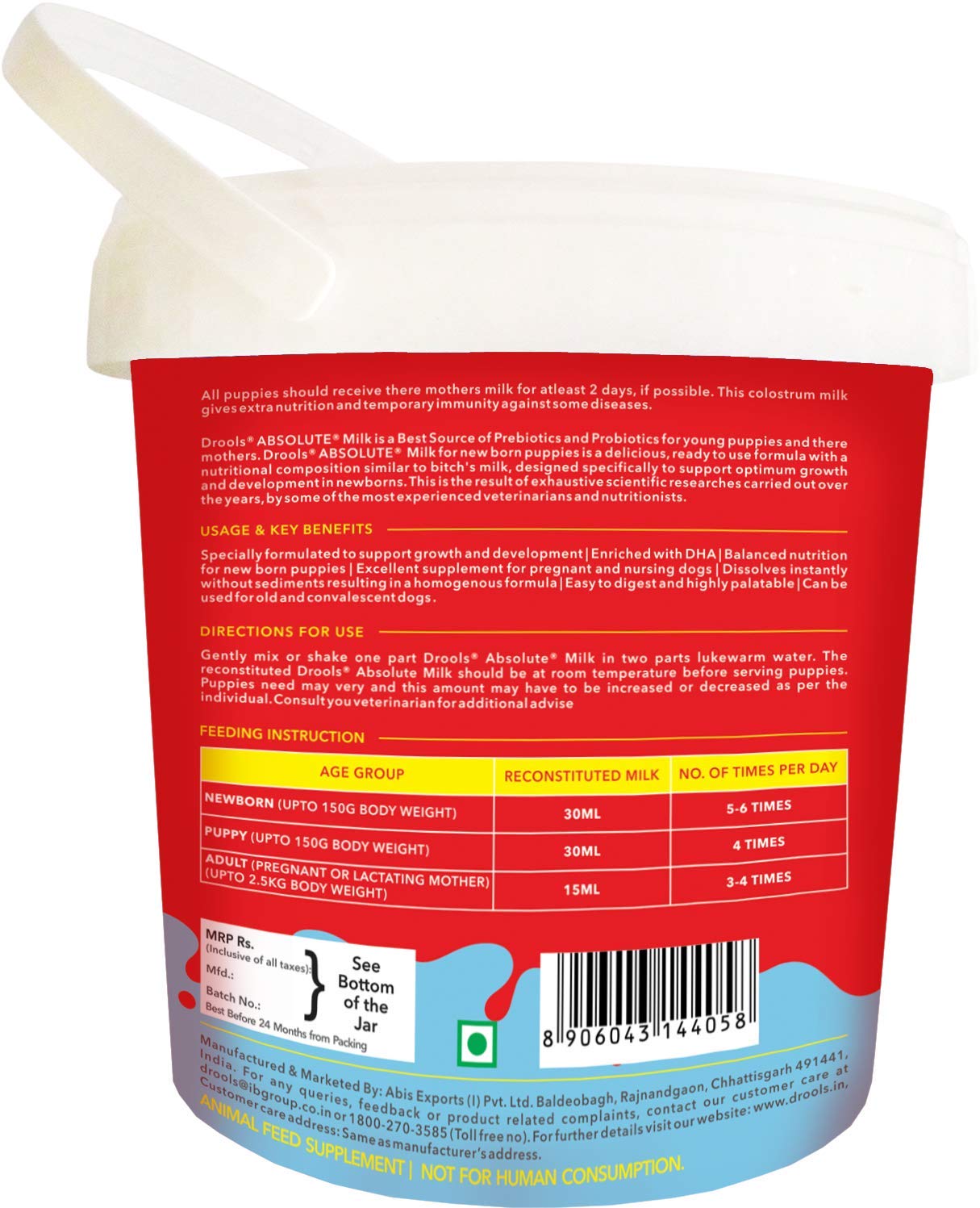 All puppies should receive their mother’s milk for at least 2 days, if possible. This colostrum milk gives extra nutrition and temporary immunity against some diseases. Drools Absolute Milk is the best source of probiotics and probiotics for young puppies and their mother. It is a delicious, ready to use formula with a nutritional composition similar to mother’s milk, designed specifically to support optimum growth and development of the newborn. This is the result of exhaustive scientific researches carried out over the years, by some of the most experienced veterinarians and nutritionists.