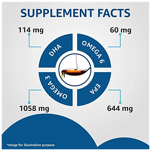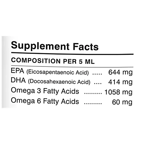 EPA (Eicosapentaenoic Acid) – 644mg ; DHA (Docosahexaenoic Acid) – 414 Mg ; Omega 3 Fatty Acids – 1058 Mg ; Omega 6 Fatty Acids – 60 Mg
