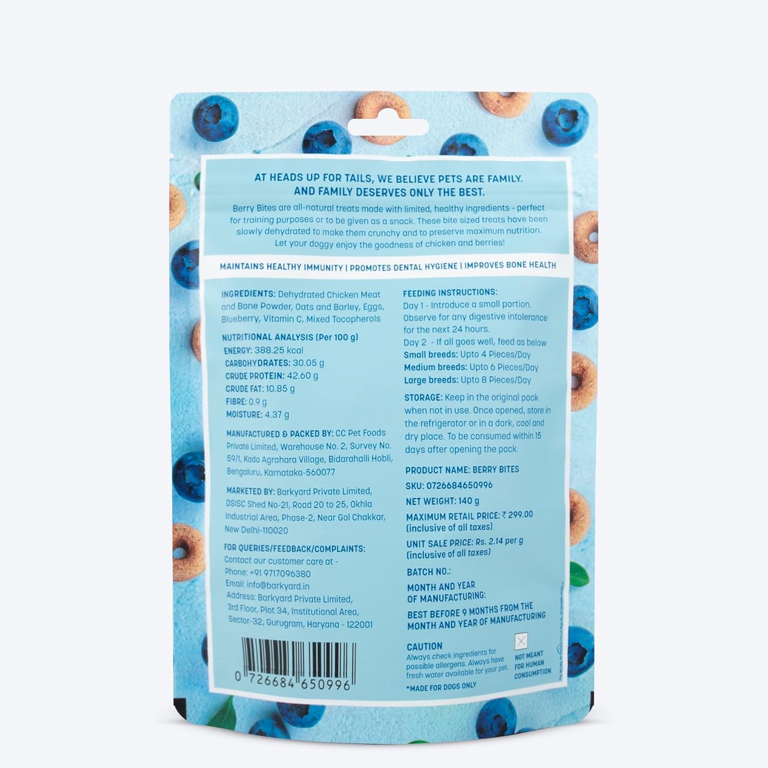 Made with natural ingredients, Berry Bites is the perfect snack addition to your dog’s palate. A fine blend of high-protein chicken and antioxidants-packed blueberries, these bite-sized treats have been slowly dehydrated to make them crunchy and to preserve maximum nutrition.