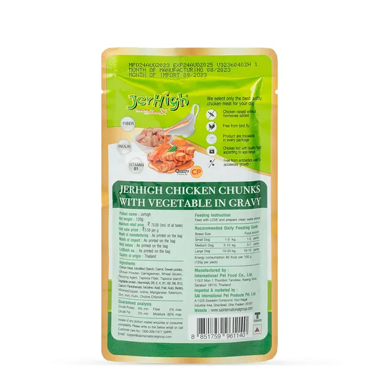 JerHigh Chicken and Vegetable in Gravy is a premium dog food suitable for all dog breeds and chock full of nutritional value, components of inulin and fiber to improve digestive system and excretory system. It is made from real chicken and vegetable, formed into delectable meaty chunks and topped with our delicious gravy. So terrific that your dog won’t be able to resist! Have it on its own or mix it with kibble to widen your dogs palate and increase their appetite.