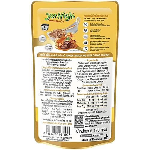 Jerhigh Chicken and Liver in Gravy Wet Dog Food 120g is a premium wet dog food crafted with real chicken and liver, providing a rich source of high-quality protein and essential nutrients. This complete and balanced meal delivers delicious flavor combined with nutritional benefits, supporting your dog’s overall health and vitality.