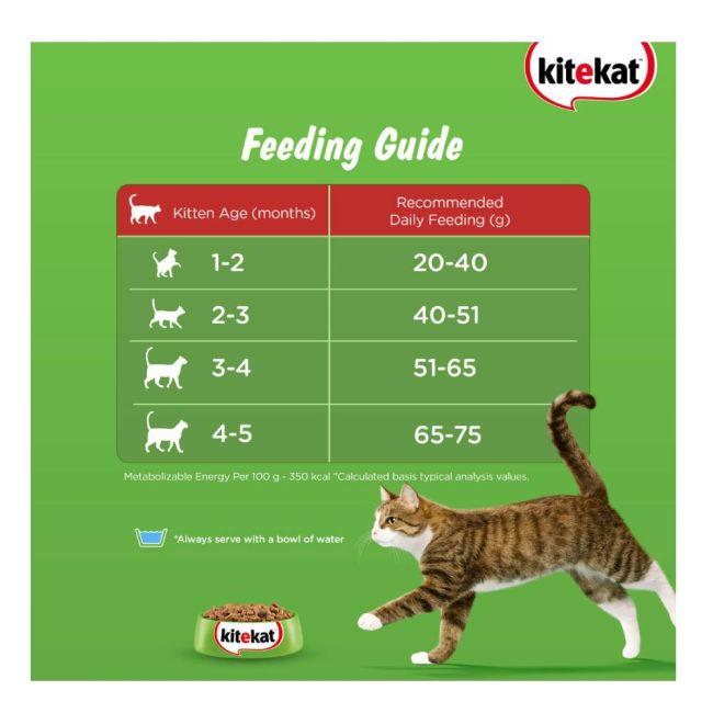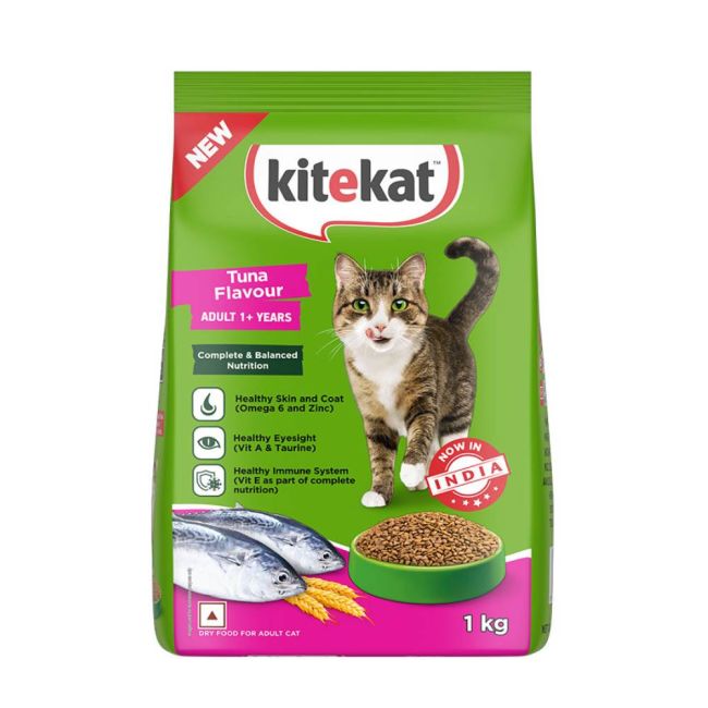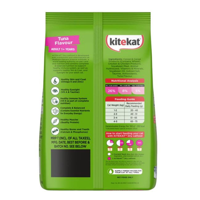 KITEKAT cat food provides complete and balanced nutrition that keeps your feline friend healthy and energetic. KITEKAT™ Adult (1+ Years) Dry Cat Food, Tuna Flavour, is packed with mouth-watering crunchy kibbles that delight your cat. Made with quality ingredients such as tuna, this dry cat food is specially formulated for your adult cat. It contains essential nutrients for your cat’s everyday energy. It includes Omega 6 & Zinc for healthy skin and coat, as well as Vitamin A & Taurine for healthy eyesight. It also contains Vitamin E for a healthy immune system along with quality protein for muscle health. In addition, it contains Calcium & Phosphorus for healthy bones and teeth. KITEKAT™ dry cat food is developed with nutritionists and veterinarians at Waltham Petcare Science Institute, a world-leading pet care and nutrition authority. Refer to the back of the pack for the feeding guide. Support your cat’s vitality and uncover their joy with KITEKAT™.