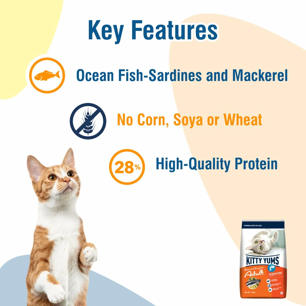 Kitty Yums Dry Cat Food Ocean Fish Adult is formulated with high-quality ocean fish, such as sardines and mackerel. This meal with more meat and less grain provides your cats with a higher level of protein for stronger, bones and muscles.