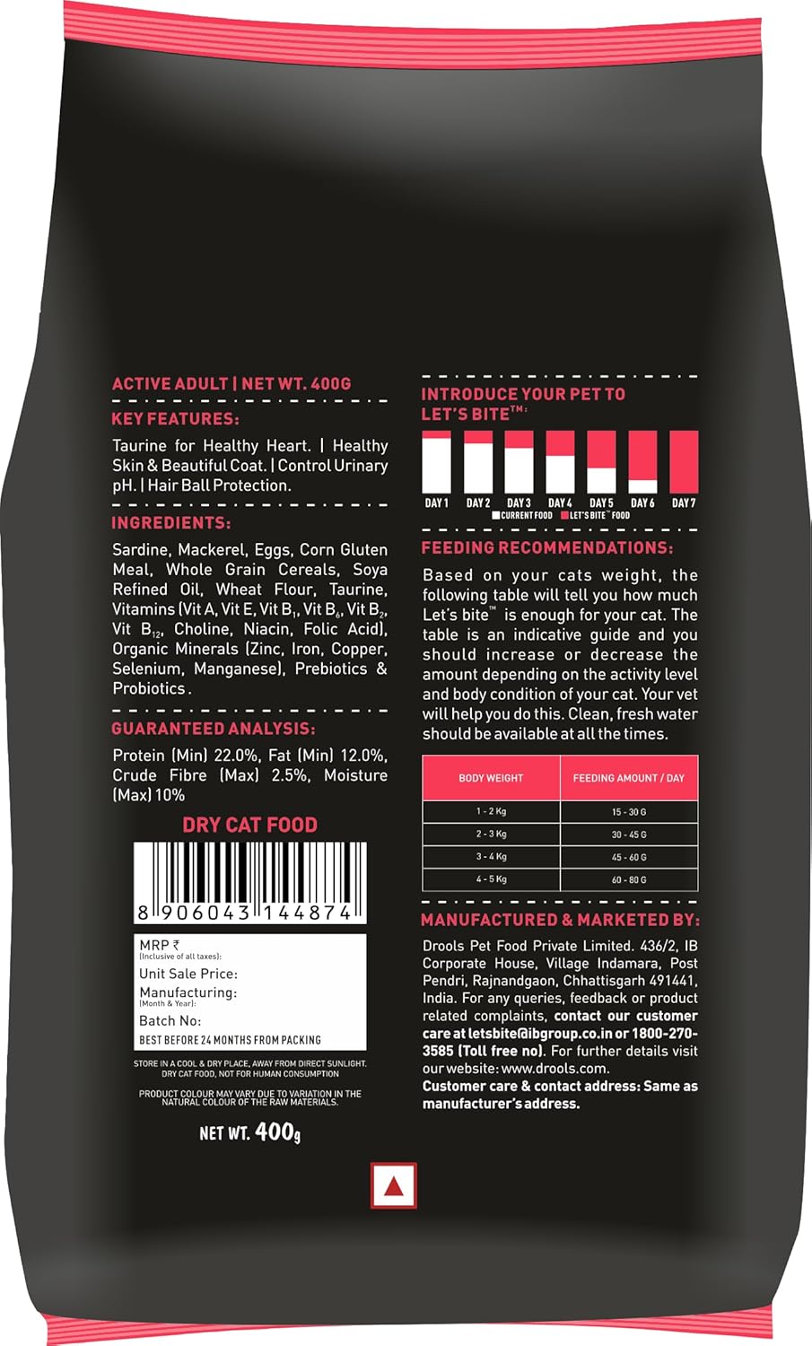 Let’s Bite Cat food is made with taurine, an essential amino acid which helps maintain a healthy heart and improves eyesight. Omega-3 & 6 fatty acids keep the coat beautiful and lustrous. The organic minerals, along with other ingredients, maintain the cat’s urinary pH. Prebiotics (natural fibres) protect cats from hairball formation, and probiotics keep their digestive system healthy.