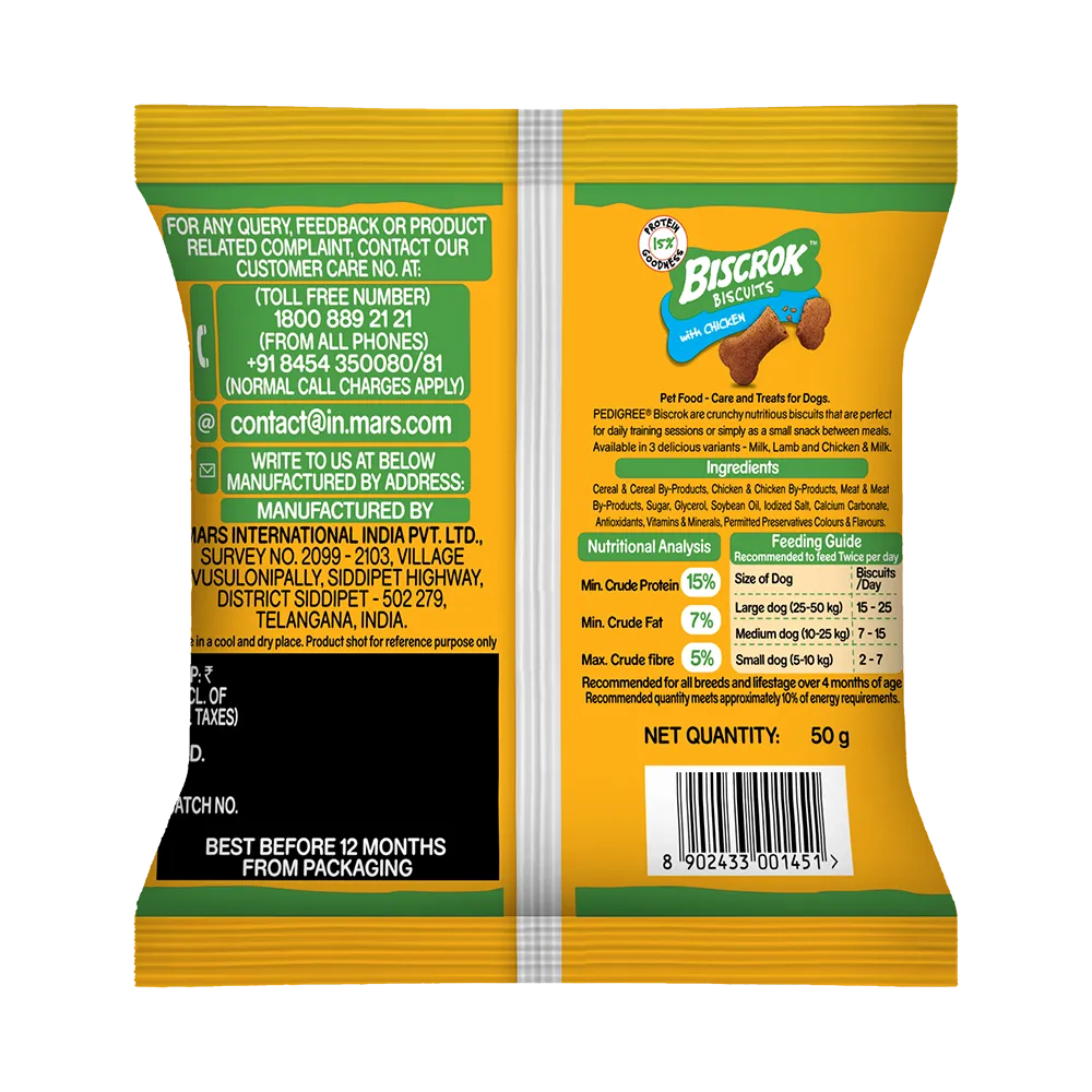 BISCROK™ treats are crunchy and nutritious bone-shaped biscuits that are perfect for daily training sessions or simply as a small snack in between meals. These biscuits are also a good source of protein, calcium, vitamins and minerals. BISCROK™ Biscuits can help meet 10% of your dog’s daily energy requirement when fed as per the recommended quantity.