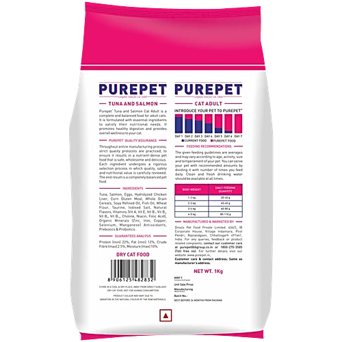 Purepet’s Adult Cat Dry Food in Tuna & Salmon flavour is a complete and balanced diet formulated to provide your feline friend with overall wellness. Enriched with high-quality tuna and salmon, this palatable and easy-to-digest food helps maintain your cat’s beautiful skin and coat.