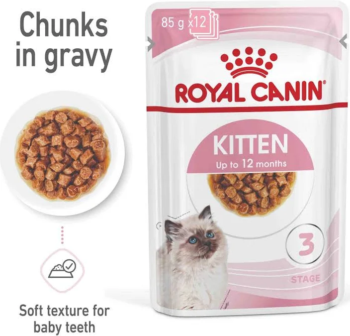 Royal Canin Kitten Wet Food in Gravy is specially crafted for kittens up to 12 months. It supports healthy growth, strong immunity, and digestive comfort. With high-quality proteins, essential vitamins, and tender chunks in gravy, it offers balanced nutrition to help kittens develop into healthy young cats.