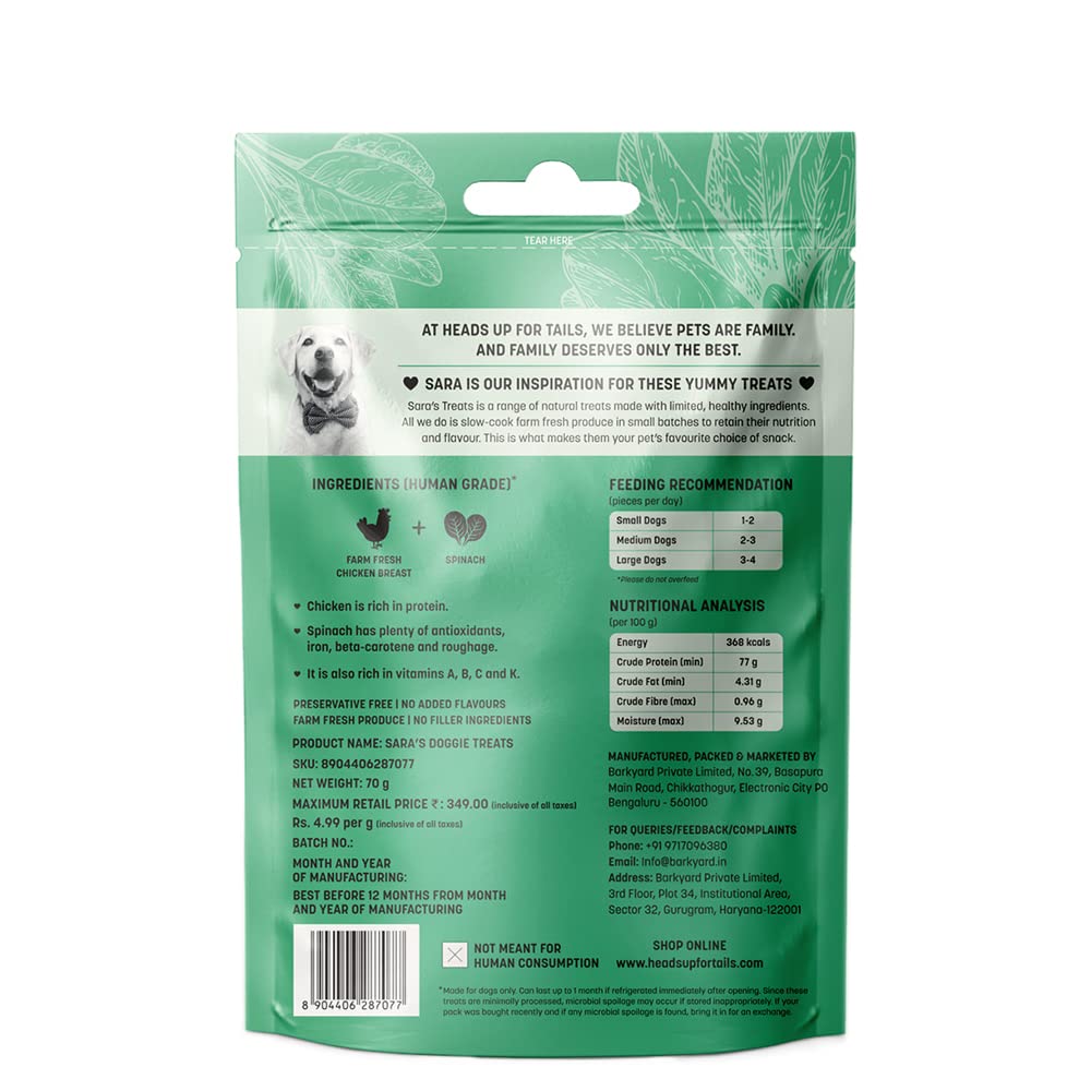 Sara’s Doggie Treats Chicken Jerky with Spinach is crafted using farm-fresh chicken, slow-cooked for hours at carefully controlled temperatures. This process enhances the rich flavours, making each piece especially enticing for your dog.