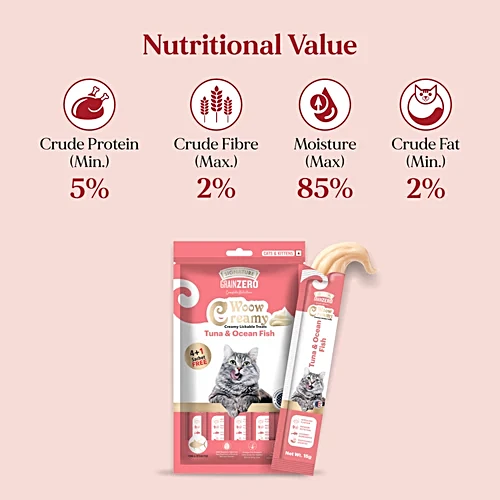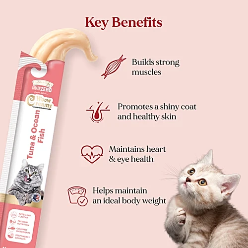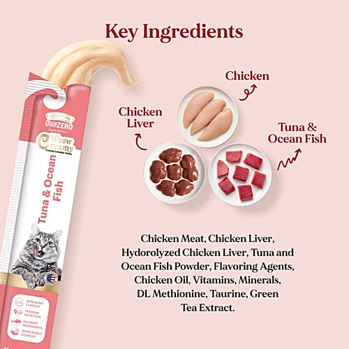 Signature GrainZero Woow Creamy Lickable Cat Treats – Tuna & Ocean Fish (4+1 Free Sachets) are Premium Grain-Free Lickable Treats with authentic tuna & ocean fish flavour and smooth creamy texture.