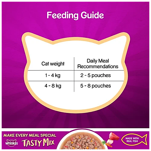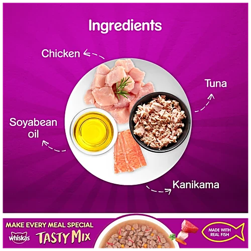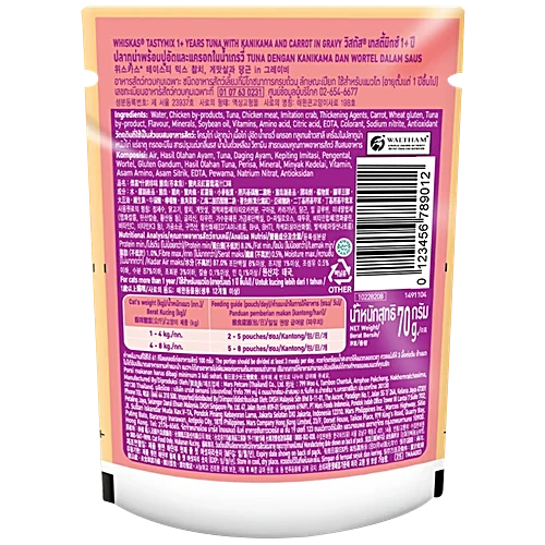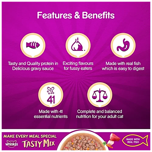 Treat your feline friend to the delicious Whiskas Tasty Mix Wet Cat Food, specially formulated for cats 1 year and older. This delightful blend features tender tuna, complemented by kanikama and carrot, all simmered in a savory gravy that will have your cat purring for more. Whiskas ensures that every meal is not just tasty but also provides essential nutrients for your cat’s overall health and well-being.