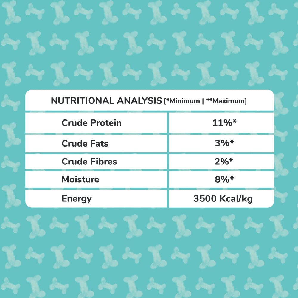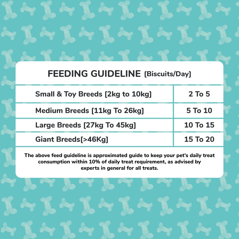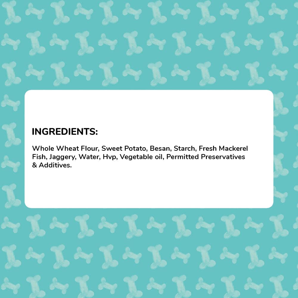 Hypoallergenic, healthy biscuits Good for skin and coat health, eyesight and muscle growth. Made of whole wheat flour and nutrient-rich chickpea flour Made with real, human-grade and fresh mackerel fish and sweet potatoes No artificial flavouring, processed sugar or maida (refined flour) Low fat, low calorie and easy to digest Rich in protein, vitamins, Omega-3 fatty acids, potassium, calcium and iron Gently oven-baked for maximum nutrient retention Suitable for dogs above 8 weeks of age.